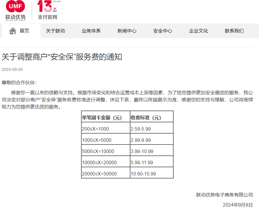 日前在线配资炒股平台,持牌支付公司联动优势电子商务有限公司(简称“联动商务”)发布了关于调整商户“安全保”服务费的通知。